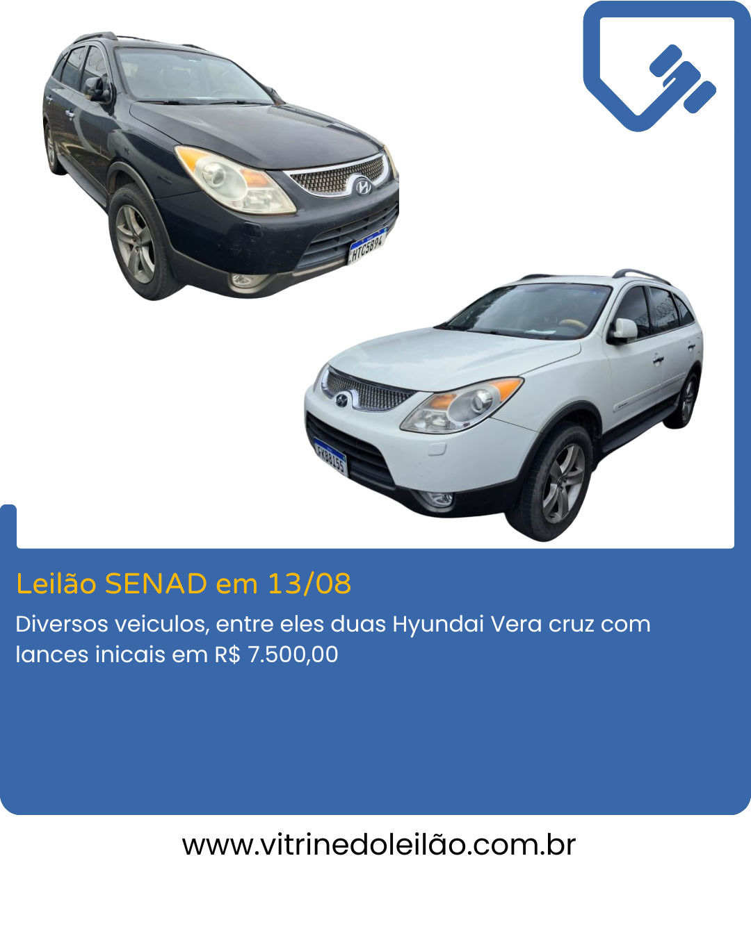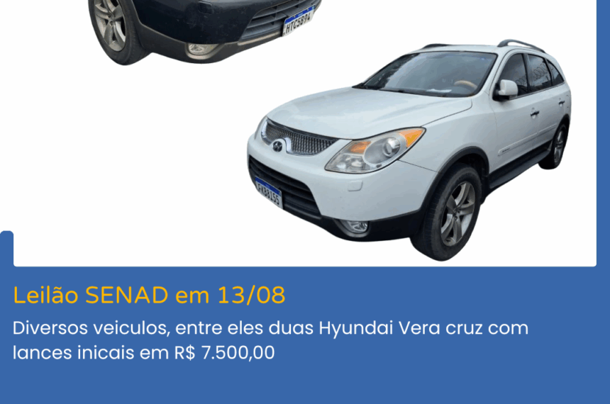 Leilão SENAD com diversos lotes em 13/08/2025, entre eles essas duas lindas Hyundai Vera Cruz Site do Leilão: Fábio Barbosa Leilões...